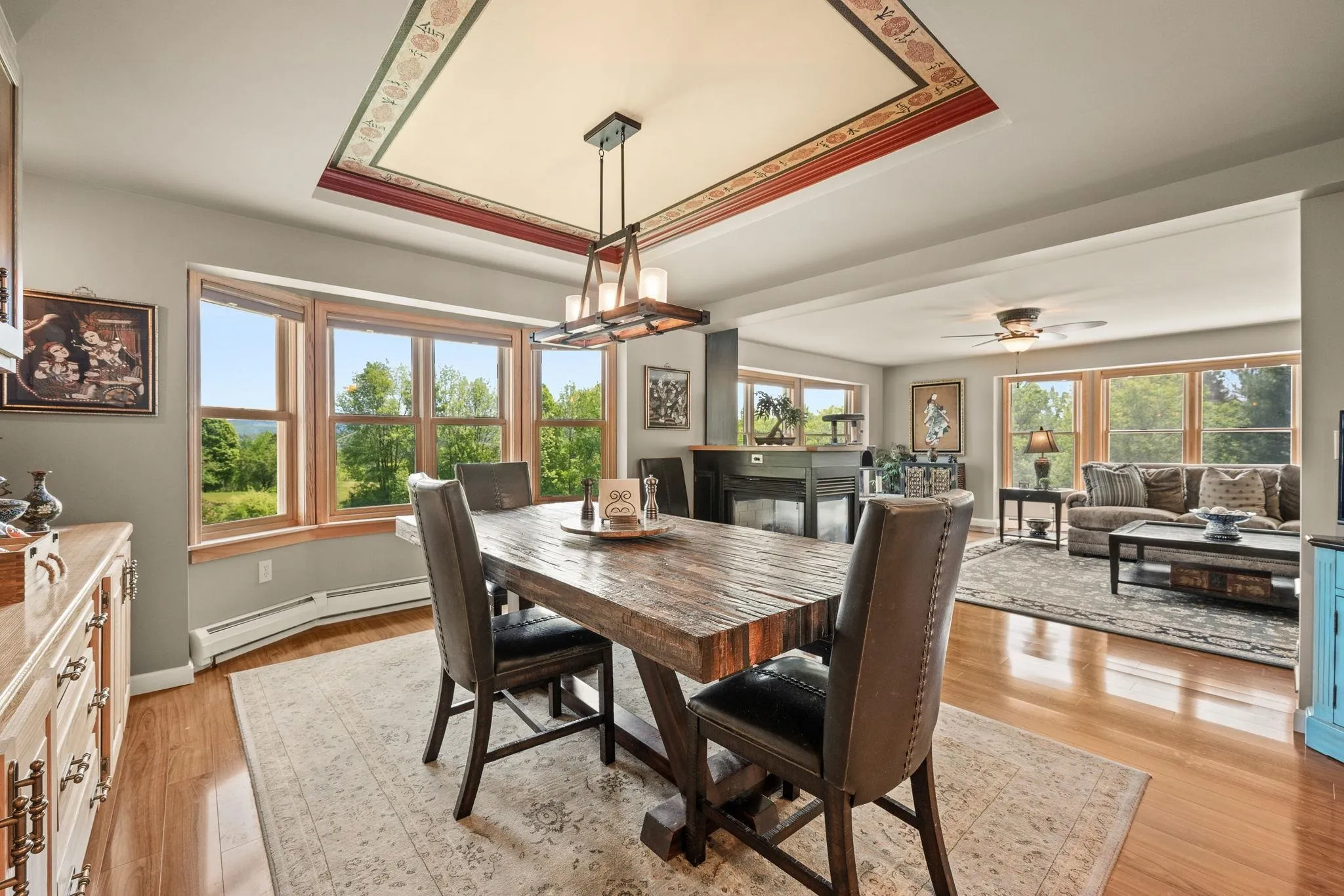 +"PublicRemarks": "Discover your own Vermont paradise, where tranquility meets luxury. This spacious 4-bedroom, 4.5-bath home offers year-round comfort, featuring 3 gas fireplaces for cozy winter nights and a stunning pool for summer relaxation. Ideal for multi-generational living, the home boasts multiple living areas across several levels. The main floor includes a double kitchen with 2 islands, 2 sinks, 2 ovens, and 2 microwaves, plus a formal dining room and an eat-in kitchen with coffered ceilings. Quartz countertops and white ash cabinetry complement the pool and backyard views. The living room features a three-sided glass fireplace and breathtaking mountain vistas. An office and ½ bath round out the first floor. Upstairs, find 2 en-suite bedrooms, 2 additional bedrooms, and a laundry room. The luxurious primary suite includes a fireplace, walk-in closet, private balcony, and jetted tub. The full daylight basement offers an in-law suite with a second kitchen, bath, sauna, and den with a third fireplace, plus a concrete patio overlooking the pool. Additional features include a generator, 8 A/C units, and a 2-car garage with a deck above."