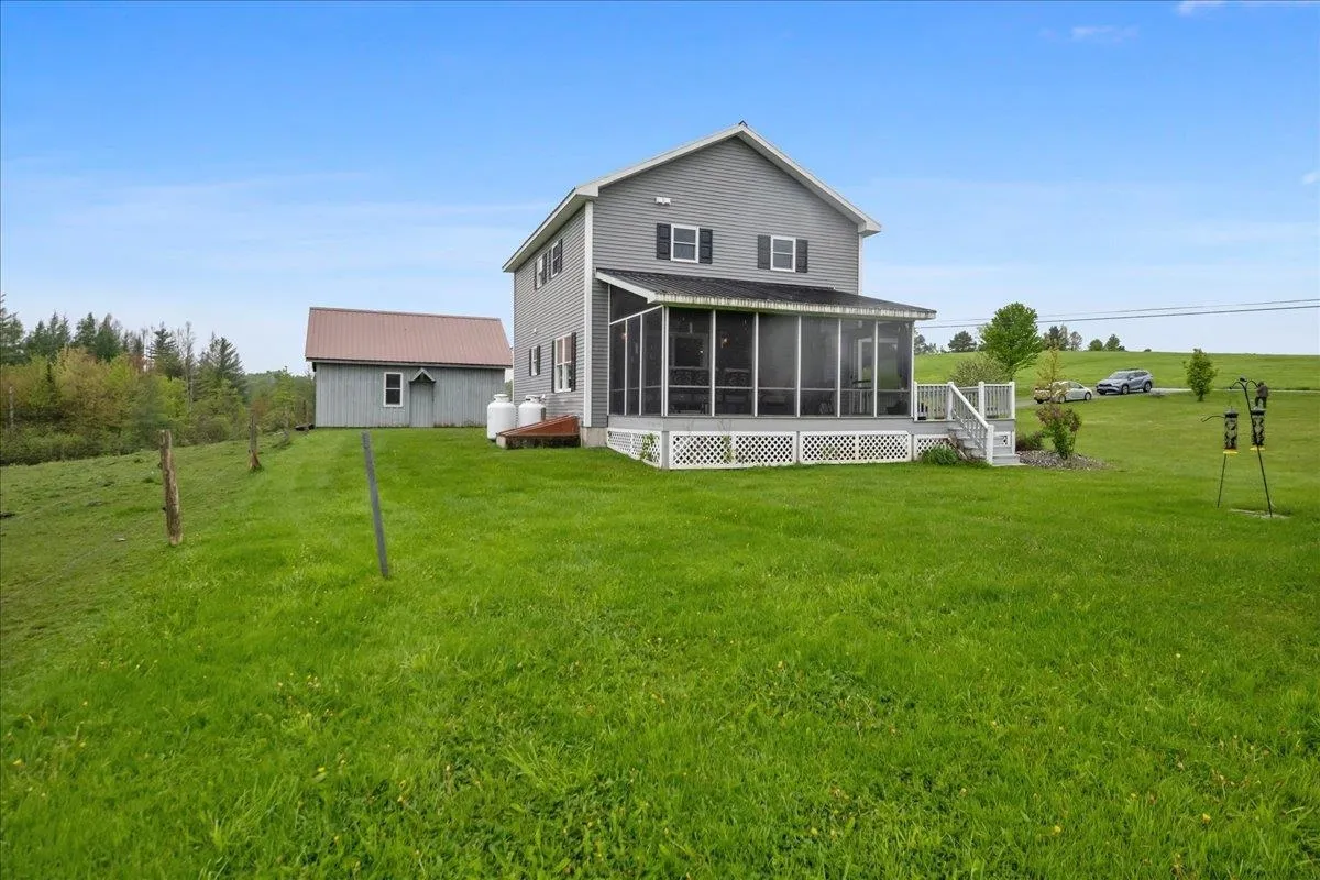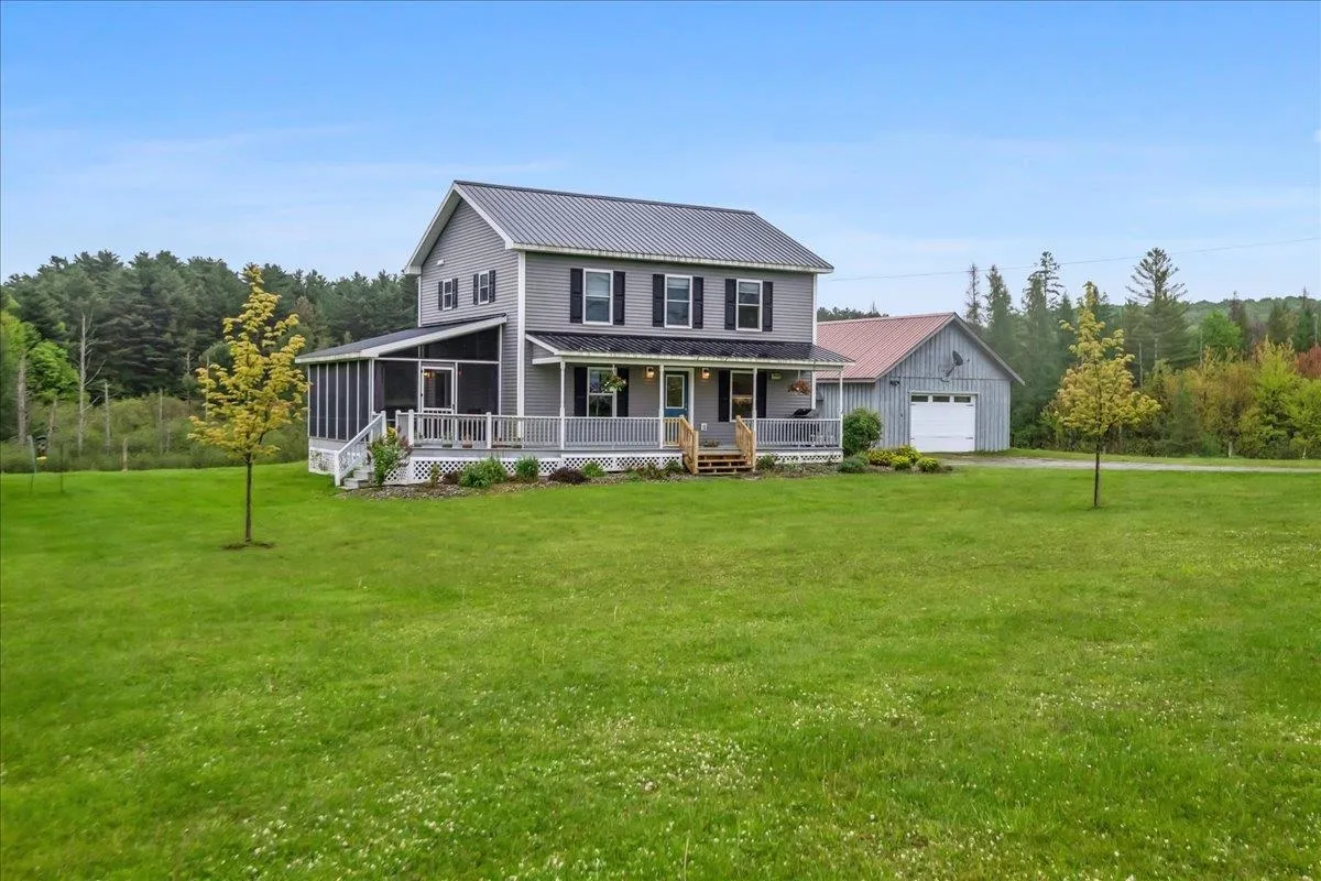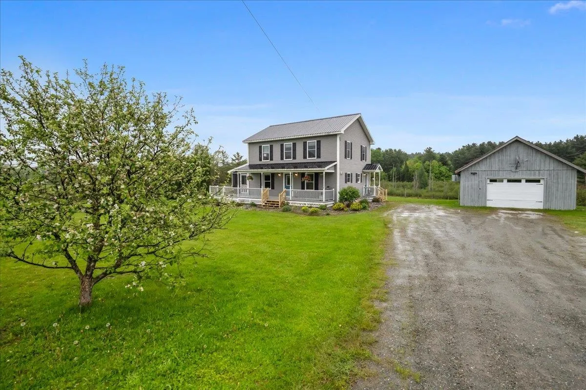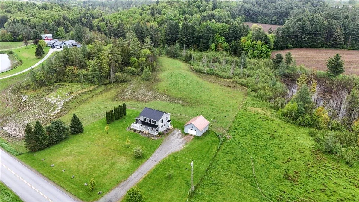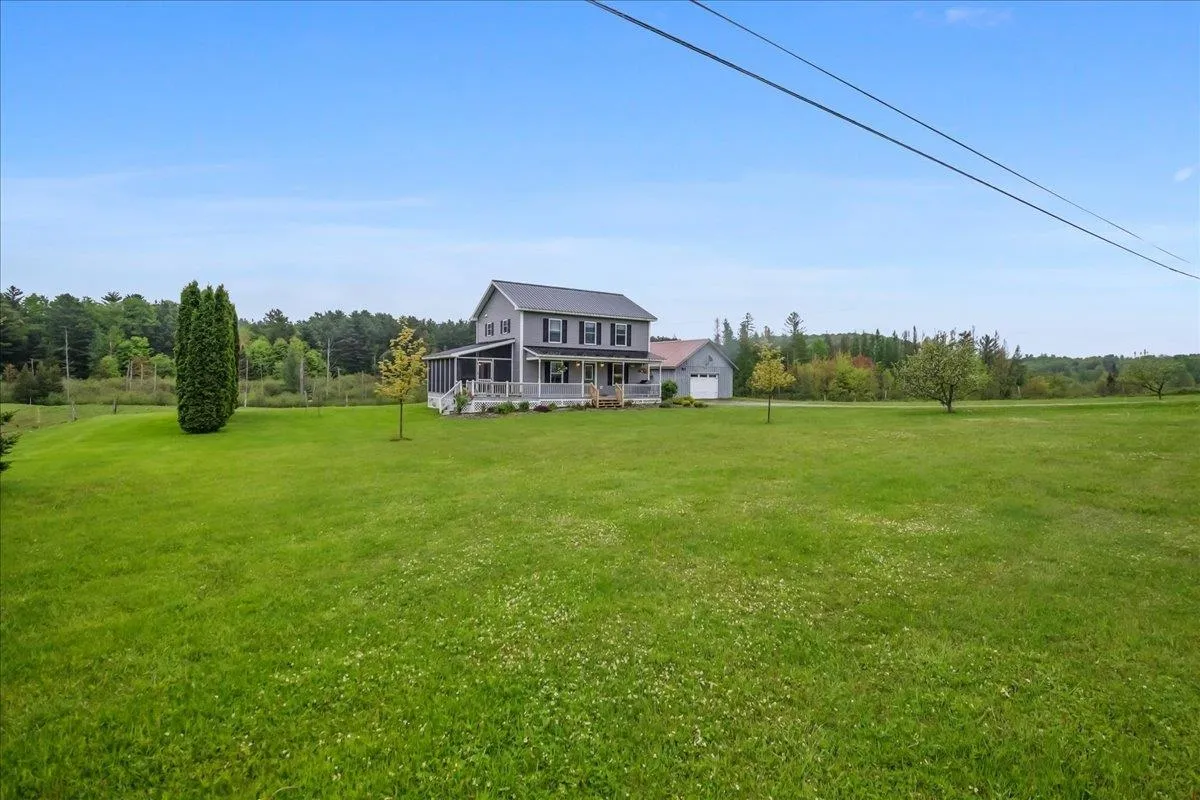 +"PublicRemarks": "Set on over 5 peaceful acres and surrounded by open farmland, this modern farmhouse offers the best of Vermont living—quiet, private, and just minutes from town. Located on a paved country road, the home features Natural Birch hardwood floors, abundant natural light, and sweeping views from nearly every window. Enter through the side door into a spacious mudroom with built-in cabinetry—ideal for everyday storage. The kitchen is finished with long granite countertops and overlooks the fields beyond. Just off the kitchen you have a 1/2 bath and an open living and dining area filled with light to offer a welcoming space to gather or unwind. Upstairs, you’ll find all three bedrooms and 2 full baths. The primary bedroom includes a generous ensuite bath and ample closet space. Thoughtful storage throughout makes everyday living easy. Outside, relax on the half-wraparound porch with a screened section perfect for warm summer evenings. A detached 2-car garage adds convenience and functionality. Located in a high school choice town, just minutes to Enosburg for daily essentials, close to Jay Peak for year-round recreation, and about an hour to Burlington—this home is a perfect mix of space, privacy, and accessibility."
