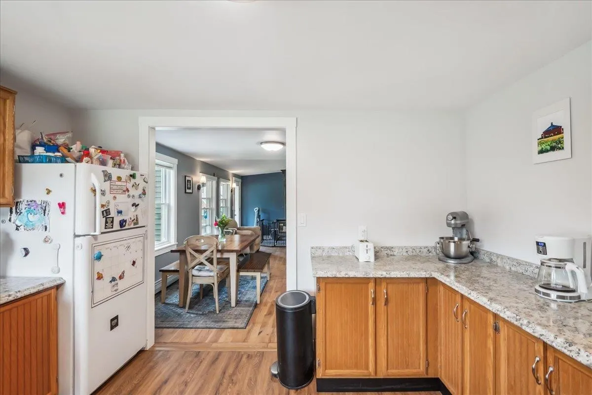 +"PublicRemarks": "Exquisite turn-of-the-century residence in coveted Montpelier location, tucked away at the edge of downtown with simply remarkable views of the State House Dome. Impeccably restored with utmost attention to detail. Enter through the stylish mudroom with slate flooring into the renovated kitchen, highlighted by Vermont marble counters, custom cabinets, Capital propane range, and a wood stove to gather round. Elegant dining and living rooms, showcasing original wood built-ins, pocket doors, window seating, and fireplace. Handsome front foyer. Convenient half bath and den with a second fireplace complete the first floor. The second floor boasts an en suite bedroom with a tiled shower and walk-in closet, a full bath with laundry, and two more bedrooms, one of which is grandly spacious, along with a small study/home office. Both levels feature gleaming hardwood & softwood floors. Walk-up attic provides excellent storage and solid potential for future expansion. Extensive upgrades include but not limited to full house electrical rewire, updated plumbing, metal roof with hand-cut copper work, copper gutters, rebuilt chimneys with custom copper caps, new insulation, and rebuilt and repointed period stonework on the cellar walls. The thoughtful renovations preserve the integrity and charm of this historic home and even the functional upgrades are works of art! Gracious front porch. Architecturally designed landscape with custom, local granite work, terraced yard, pathways, and plantings. Granite cobblestone driveway. Just a stone's throw from Hubbard Park trails, the Farmers Market, and the State House Lawn. Come see it to believe it."