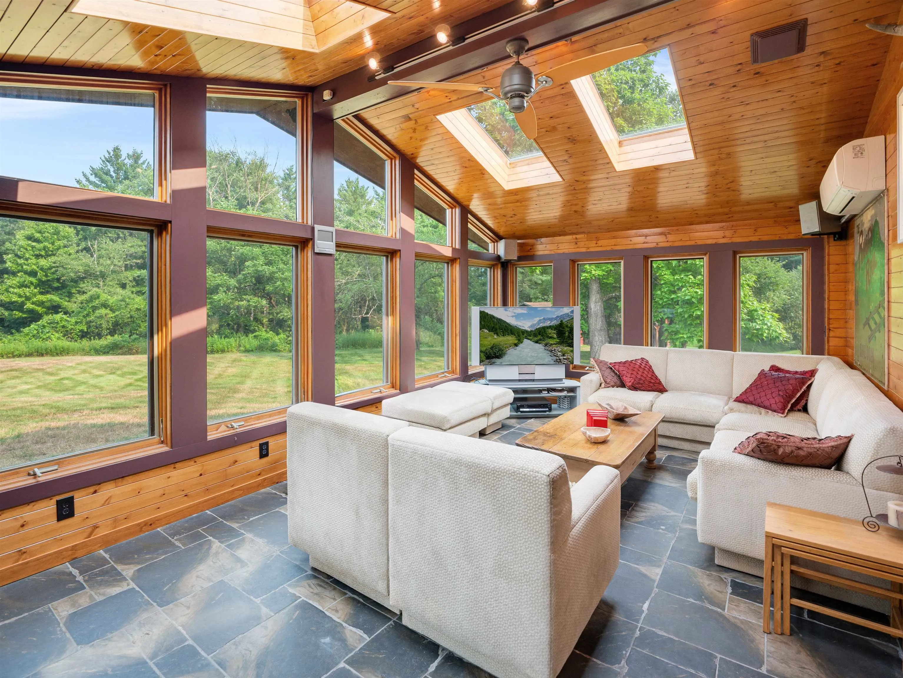 +"PublicRemarks": "Mid-Century Mountain Retreat in Castleton- This one-of-a-kind mid-century ranch sits on nearly 5 private acres with mountain views, an inground pool, a pond, and a separate guest house. Designed with stacked slate details inside and out, this home is a true Vermont retreat. Step into a stone-tiled foyer that opens to the great room—highlighted by vaulted ceilings, floor-to-ceiling windows, and a stunning slate fireplace. The home is all about light and views. French doors lead to a Trex deck and pool area overlooking the expansive backyard. The kitchen is modern and well-equipped with granite counters, stainless appliances, a gas stove, and wine cooler with a stunning island with bar seating. The sunroom is filled with natural light, surrounded by windows and warm wood tones. The main level includes three bedrooms and a bonus room. The primary suite features double closets, direct access to the pool, and a bath with jetted tub and separate shower. Another large bedroom with wood accents and a full bath, plus a third bedroom with a newly renovated en suite, complete the layout. Outside, the detached guest house includes its own well, septic, and electric—plus a full kitchen, bath, gas stove, and garage. Just minutes to Lake Bomoseen, the hospital, college, and downtown Rutland—this is a rare find."