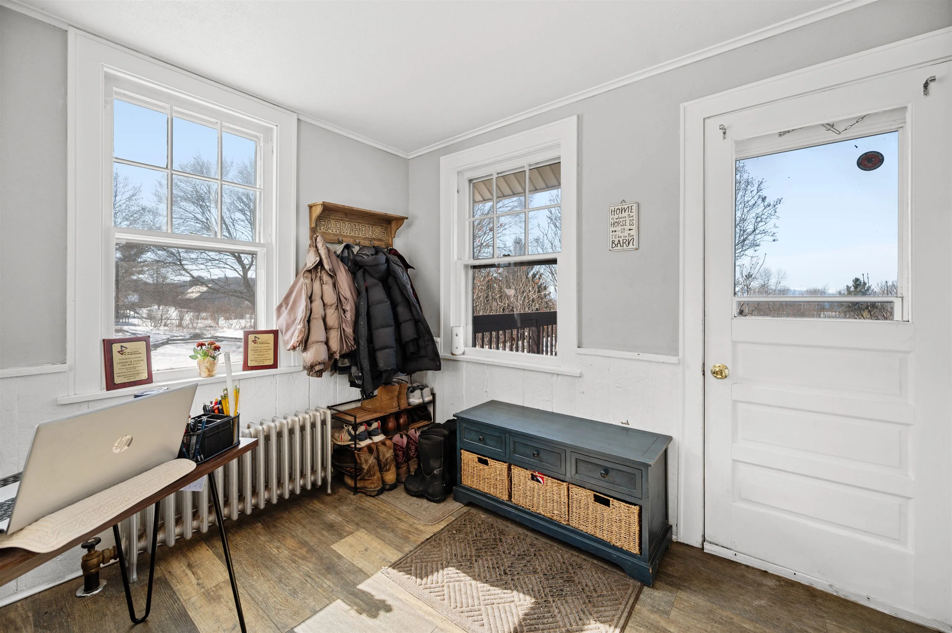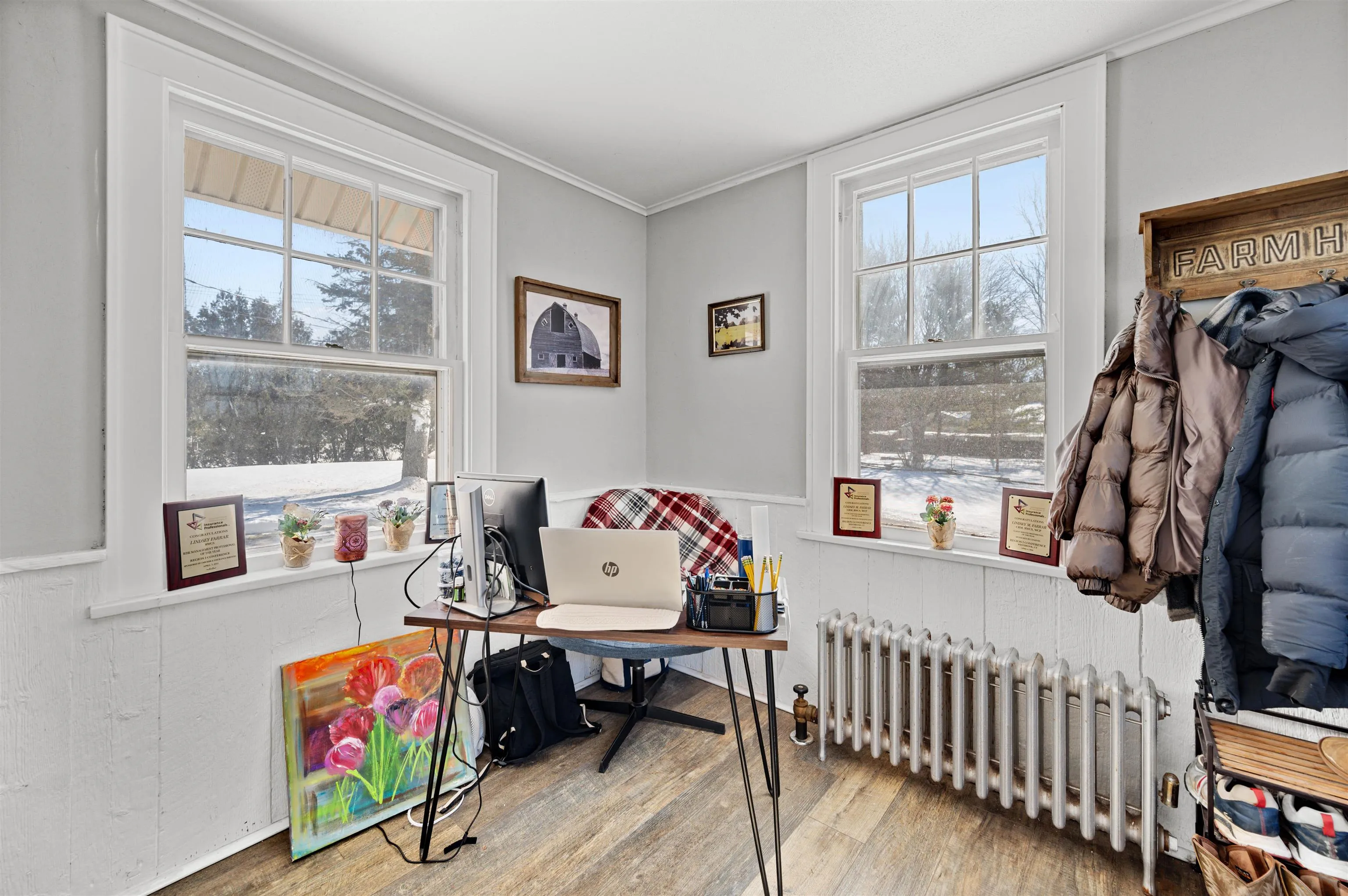 +"Remarks-Public": "Snowshoe from your doorstep! Hike through the peaceful woods! This conveniently located private home is only 10 minutes from Fairfax town amenities, and 15 minutes from St. Albans. Enjoy the beautiful, flexible space this home has to offer! With plenty of room for entertaining friends and holding family events, or multi-generational living, you'll also find private areas for work and relaxation. A large office space is just off the living room; down the hall are three good-sized bedrooms and a full, remodeled bath. The kitchen offers plenty of counter and cabinet space along with an open area for more creative endeavors or additional informal space. The den (formerly the primary bedroom) is bright, but cozy, and features a full, remodeled bath, and a recent addition is home to the owner's primary bedroom with cathedral ceiling, and spacious closet. A mudroom and 1/2 bath are just off the enclosed porch that itself offers room for storage in addition to the outside shed. The oversized 1-car garage has space for a workshop area and stairs leading to a 2nd floor storage area."