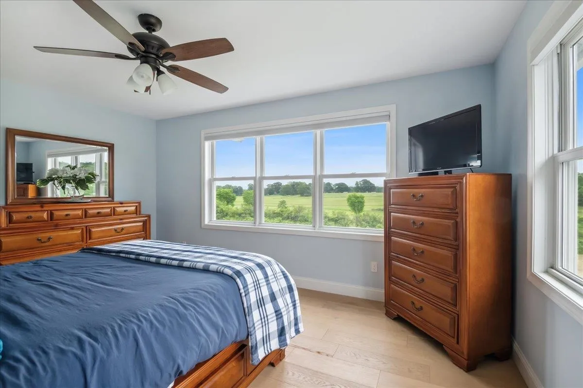 +"PublicRemarks": "This custom-built ranch has endless possibilities! Offering over 2,200 square feet, it has an open spacious feeling the minute you come in the front door. The front hall opens to a 32-foot living/dining room with a large picture window overlooking the backyard and woods beyond. The large eat-in kitchen is flooded with morning light and has access, through the mudroom, to the insulated two-car garage and basement. A family room, that is behind the garage, could be used as an office, a 4th bedroom, or possibly an ADU. Off the front hall, there are three generously sized bedrooms with hardwood floors and two bathrooms. There are generous amounts of closets, built-ins, and custom features throughout the home. A large basement has a fireplace, a bar, cedar closet, and is plumbed for a third bathroom. This lot backs up to a wooded parcel of land that is protected and cannot be developed."