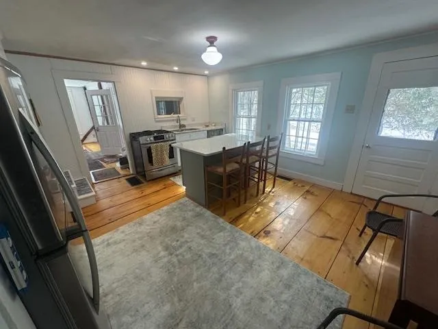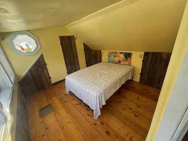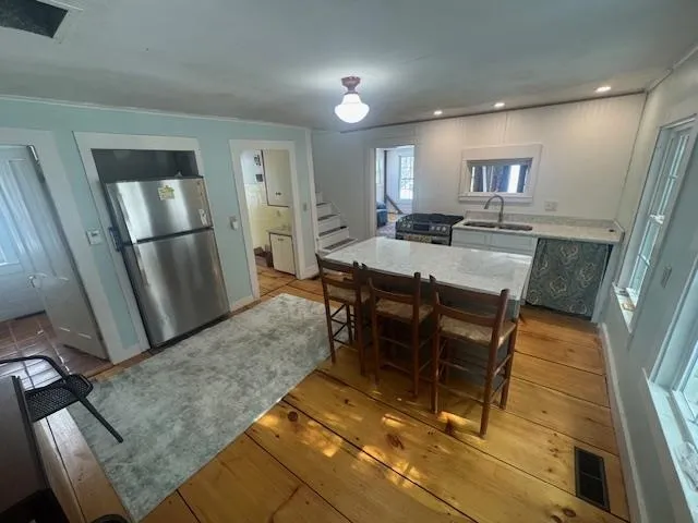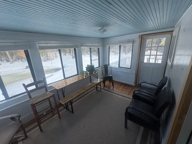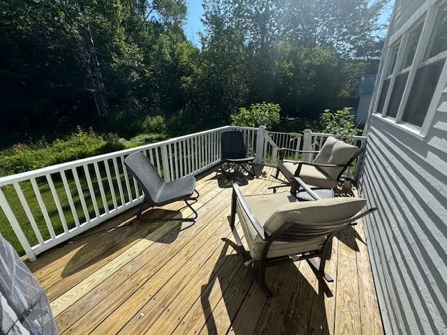 +"PublicRemarks": "Precious 2 Bedroom 2 bathroom cape in East Craftsbury Village. 1/2 acre parcel with pond and single car garage. First floor includes slate floor mud room with closet, family room with wood stove, new eat-in kitchen with island, new gas range, pantry leading to glassed in porch and back deck. Dining room/family room with built in cabinet/bookshelves. Pine floors are newly refinished. Also, a full bathroom with stackable washer/dryer and lots of storage is on the first floor. Second floor has a master bedroom with 1/2 bath and shed dormer facing the pond; a den/office center room with closet and a large bedroom with two dormers. Softwood floors throughout the second floor. There is a full basement under the cape with propane hot air furnace and spray foam insulation on foundation walls. Seller has just installed many new windows, new foundation wall on North side of living room, and more spray foam insulation in living room crawl space and glassed in porch floor. The yard is level around the home with a thick cedar hedge along the road and a rail fence along the side yard. Beautiful flowers surround the backyard pond which is lovely to walk around. Newly excavated silt pond with new inlet. There is a parking area and a detached single car garage. It has been lived in year round most of its life. A delightful place to spend time in a quiet village."