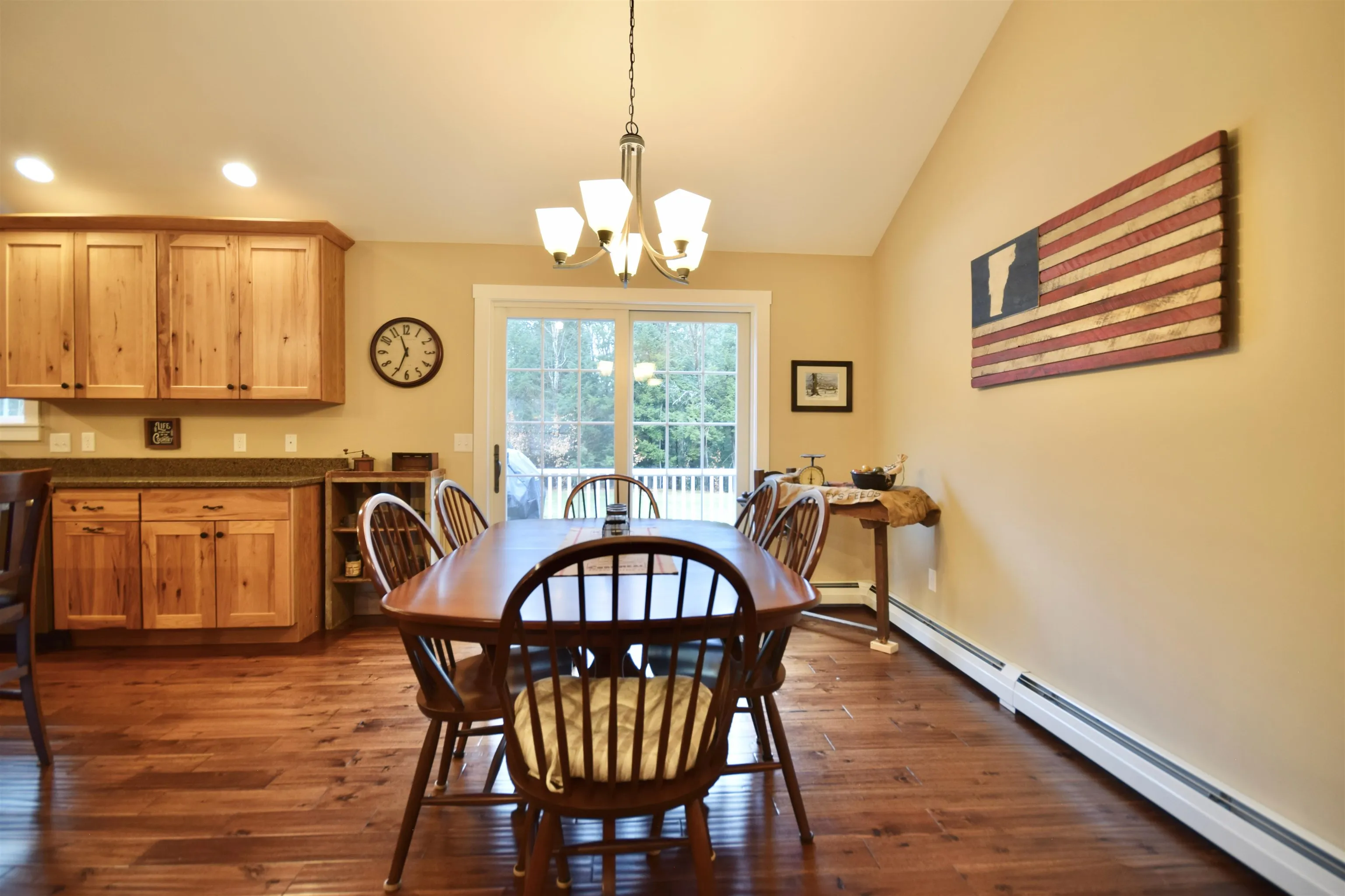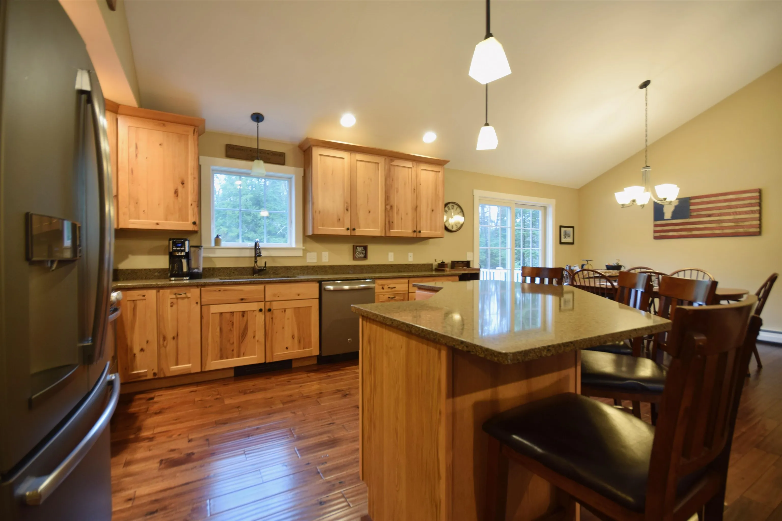 +"PublicRemarks": "This charming and spacious one level home located at the end of a serene neighborhood offers the perfect blend of modern living and nature’s tranquility. Built in 2015, this home boasts 1,752 sq ft of living space on a generous 3.21-acre lot which backs up to 121 acres of Town Forest. The home features 3 spacious bedrooms and 2.5 baths, providing ample space for families and guests. An open-concept design with cathedral ceilings seamlessly connects the living, dining, and kitchen areas, creating an inviting atmosphere for daily living and entertaining. At the center of the living room is a wood stove. Large windows allow for plenty of natural light, enhancing the home’s inviting ambiance. The primary suite features cathedral ceilings, a walk in closet and private on suite bathroom. Two mini splits to heat and cool. The full basement offers potential for a home gym, storage, or customization to suit your needs. Private and expansive outdoor area is ideal for gardening, outdoor enjoyment, recreation, or simply enjoying the tranquil surroundings. A 2.5 car attached garage offers parking and additional storage. This inviting property provides ample space for privacy and simply enjoying the natural beauty in peace. Shed for added storage. Irrigation system for a lush, green yard all summer long. This home offers proximity to local amenities, schools, and the natural beauty of Vermont make this property a wonderful place to call home."