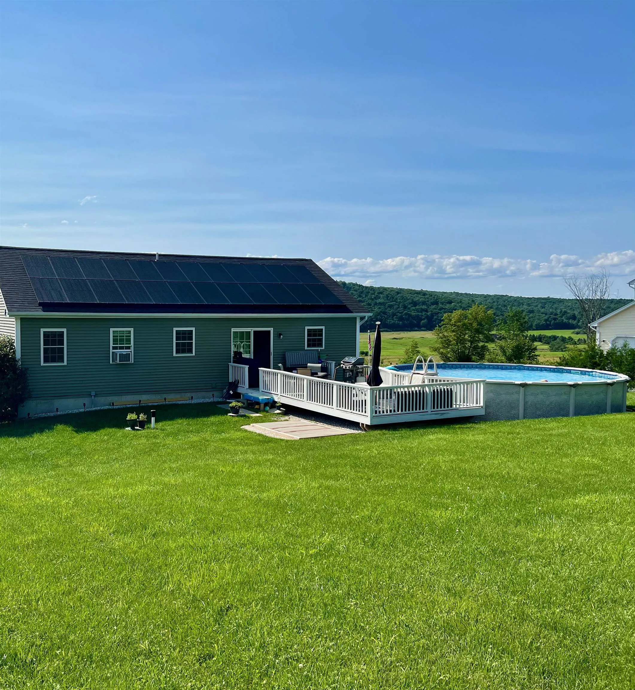 +"PublicRemarks": "Welcome to this inviting 3-bedroom, 2-bath home set in a peaceful rural community with 13 acres of common land to enjoy. Inside, the home features oak hardwood floors flowing through the living room, dining area, and kitchen, creating a warm and cohesive space perfect for everyday living. The finished downstairs family room with windows, provides bright flexible living space for your needs. Step outside and embrace the Vermont lifestyle with vast trail systems nearby, a 24-foot above-ground pool with large back deck, rolling views, and spectacular sunsets. This home also includes an 12 x 16 storage shed and 29 solar panels, which will be paid off by the seller at closing, giving the buyer a fully owned system with no lease or loan—just lower energy bills and long-term savings from day one. With a convenient central location, seated just 15 minutes from St. Albans and 30 minutes from Burlington, schedule a showing today to see this home for yourself and experience everything it has to offer!"