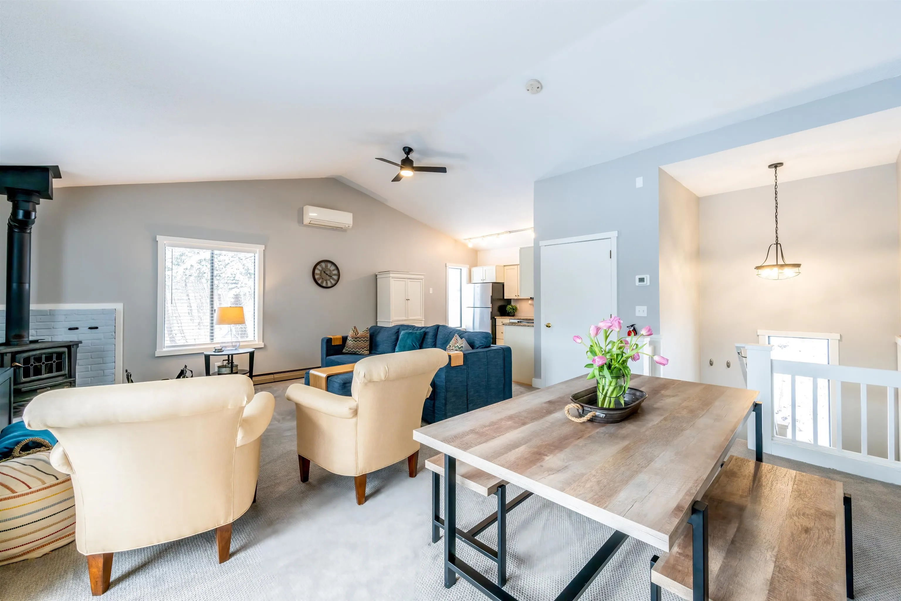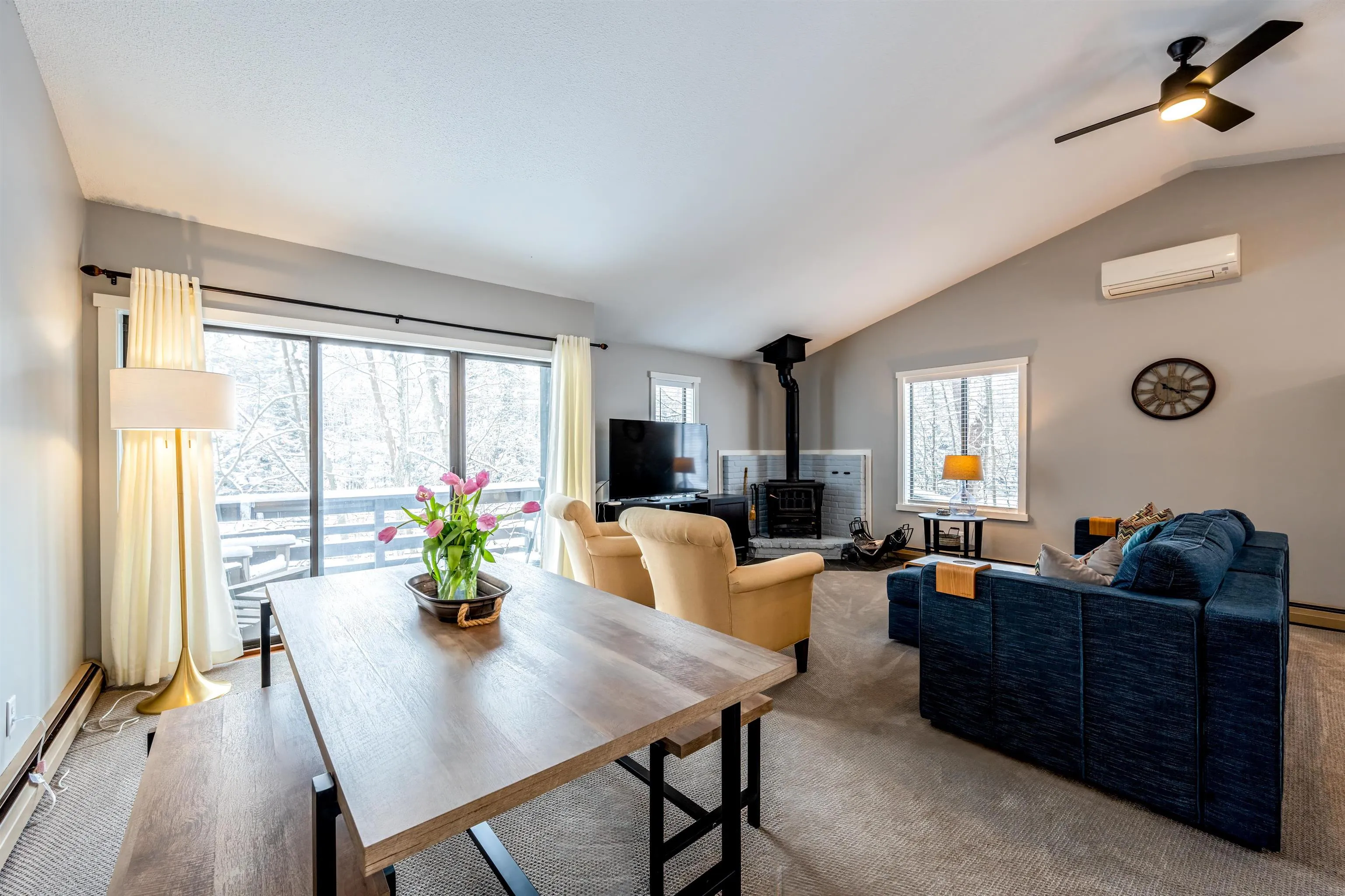 +"Remarks - Public": "Seasonal Views of the Qttauguechee River from this bright and spacious end unit at Mill Run. The recently updated condo has a great open space for day to day living or entertaining. The sitting area which is open to the kitchen and dining area has a wood burning stove for the those cold winter nights. There is a half bath on the upper level. The great room has a mini split for A/C. The lower level has 2 bedrooms, a full bath and laundry. The primary bedroom has a slider to a patio area. There is a private side yard for outdoor enjoyment. The condo comes completely furnished.Convenient to the club, walking trails, lake, ski hill, golf and pools. Easy access to shopping and highway."