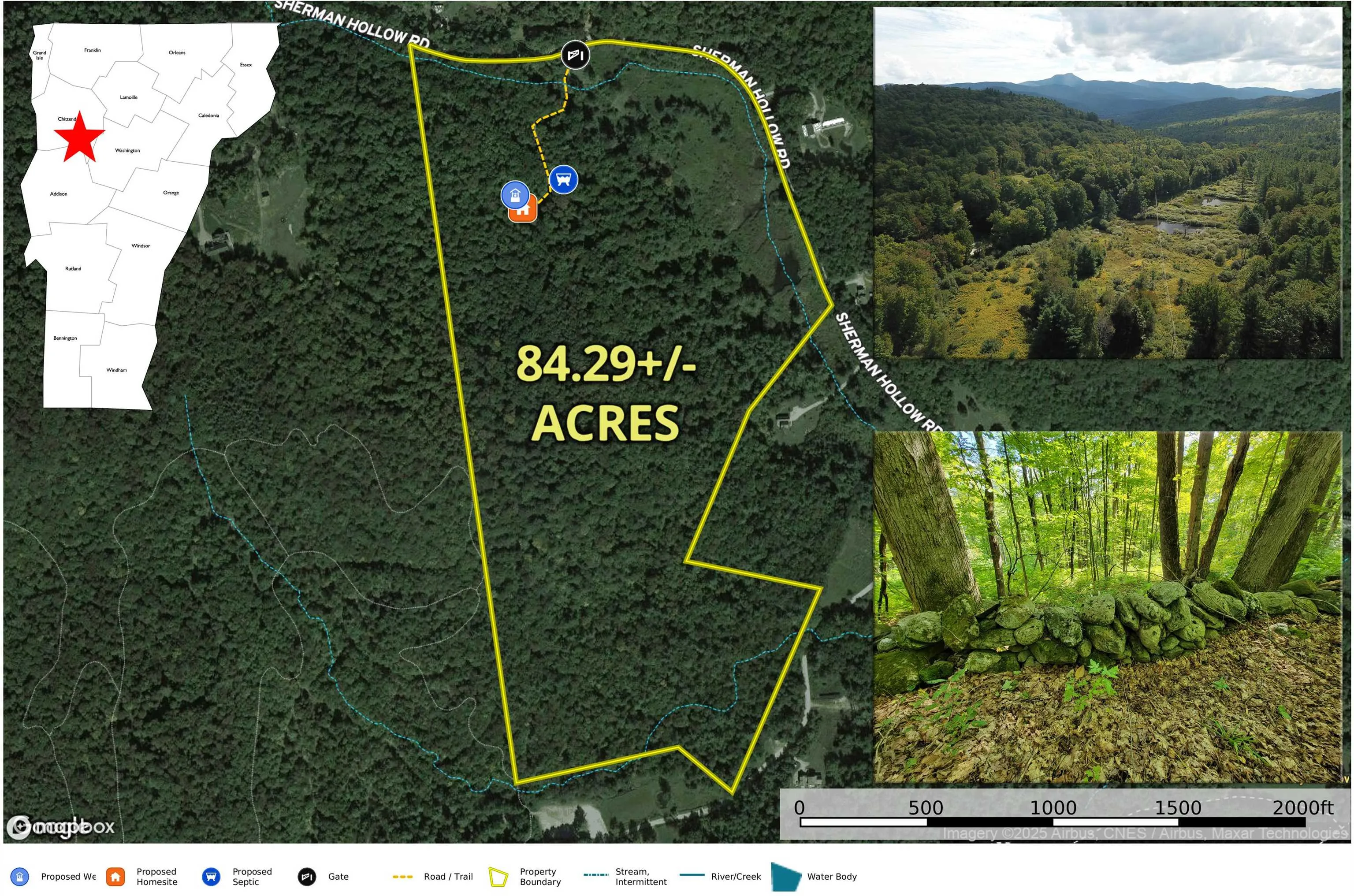 +"PublicRemarks": "84 +/- Acres of beautiful maple timber land, ready to build your Chittenden Country dream home. This gorgeous property is conveniently located on the Hinesburg border, but physically in Huntington, VT. Easy access to 2a & 116 for quick access to Burlington. Views of Camels Hump Mtn from the homesite with a little clearing (has grown up). The seller has installed a rough driveway along with electrical & internet conduit to the home site’s power vault. State approved 4-bedroom wastewater & private well permit with additional detached 2-bed accessory apartment. Utility pole at the driveway & fiber internet should be available in 2025. Appears to be plenty of room for additional homesites if a buyer desires. Located well below the home site are several beautiful cascading beaver ponds full of deer, beaver, geese & ducks. To the west of the lot there is a wonderful large acreage multi-million-dollar mountain home retreat, & to the southeast is the well-known Sleepy Hollow Ski & Bike Center. This 600-acre center has miles of wonderful ski & bike trails. The property gently slopes up to the west opening for many view opportunities. The mature woods would make a great hobby sugar operation. Numerous vintage stonewalls. Town maintained year-round road. Great spot for a hunting retreat or conservation opportunity. Not in Vermont Current Use, but we see no reason why it could not be enrolled. Large acreage in Chit. County is harder & harder to come by. Don’t miss out."