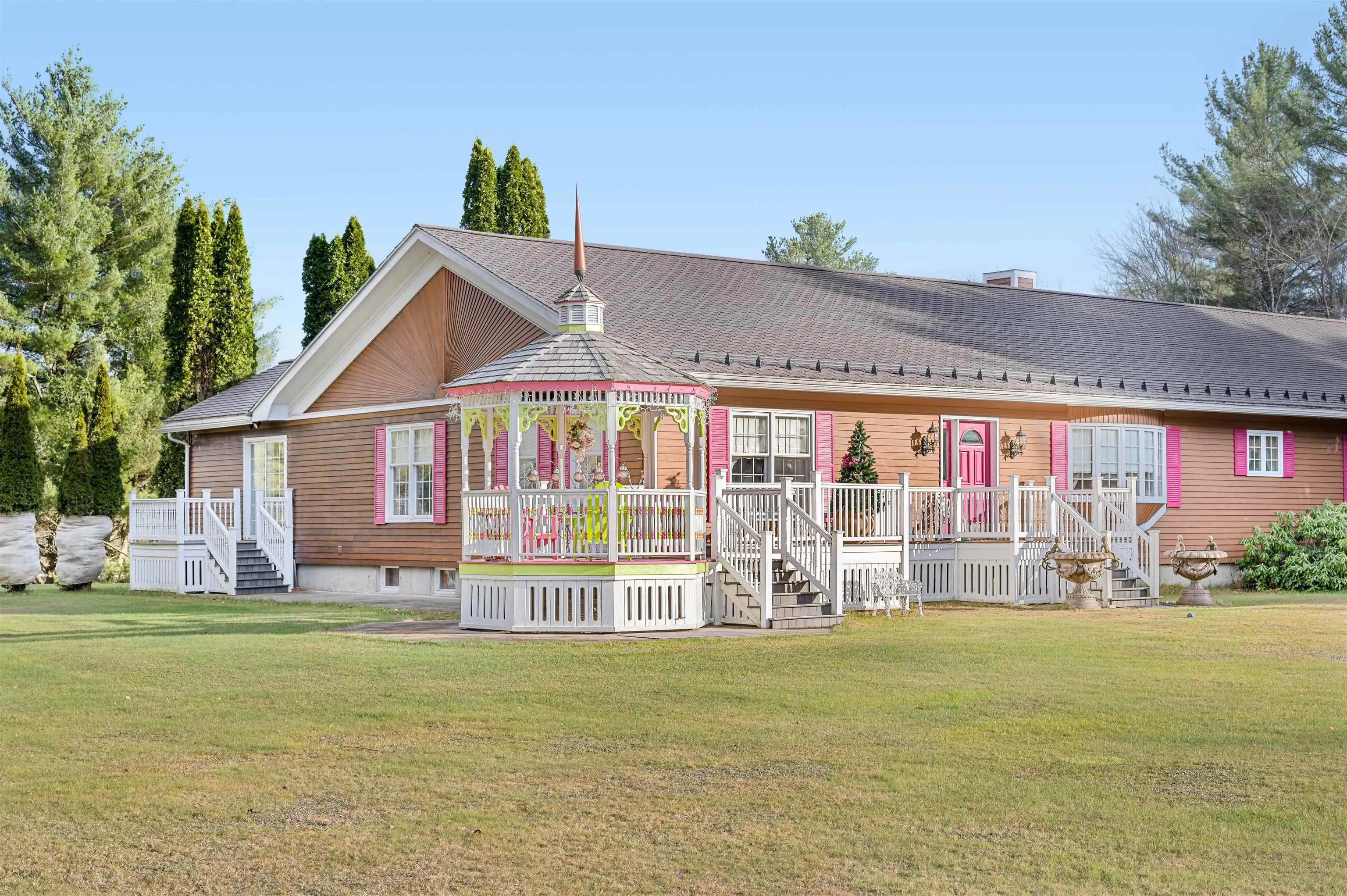 +"PublicRemarks": "What a beautiful executive estate with 50 +/- acres, barn and 6000+ sq ft of living! Not your standard Ranch-style home! This 3-BR, 3 BA house sits on a large patch of beautifully landscaped yard, nestled amongst a backdrop of gorgeous trees, for a total of 50+ acres of purely stunning land. With nearly 6,000 sq ft of living space, there is plenty of room to sprawl out. This home boasts 3 bedrooms on the main level, double living room, formal dining room, and large an eat-in kitchen. If that sounds like ample space, you'll be blown away when you step into the fully finished basement, which offers additional rooms to use in multiple ways: living quarters for extended family, a home gym, an office, or whatever suits your needs and lifestyle. Outside, enjoy the serene surroundings from the front porch and the back deck and gazebo. You will be so enchanted by the tranquility of this property that sits on a knoll that you may find yourself wanting to spend most of your time outside! The meticulous landscaping is charming and lends an air of whimsy. The attached 3+ car garage offers plenty of storage space for lawn and recreational equipment, The 40x70 pole barn with heated tack room is certainly an unexpected bonus to this already amazing property. Horse enthusiasts, take note! This exceptional property offers so much, that it must be seen to appreciate it all. If you are ready to own a true piece of Vermont paradise, this home just may call to you!"