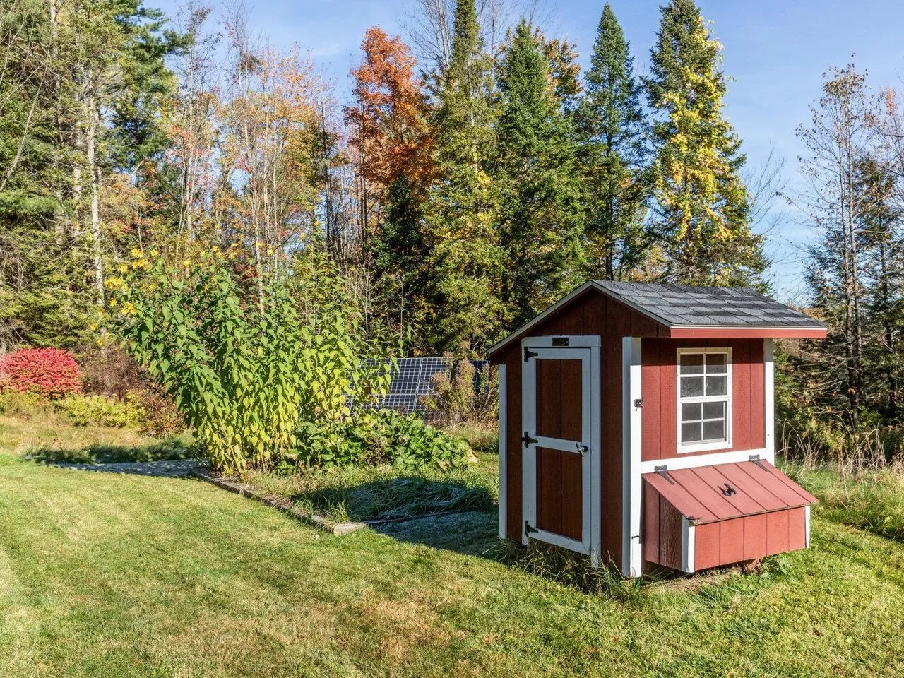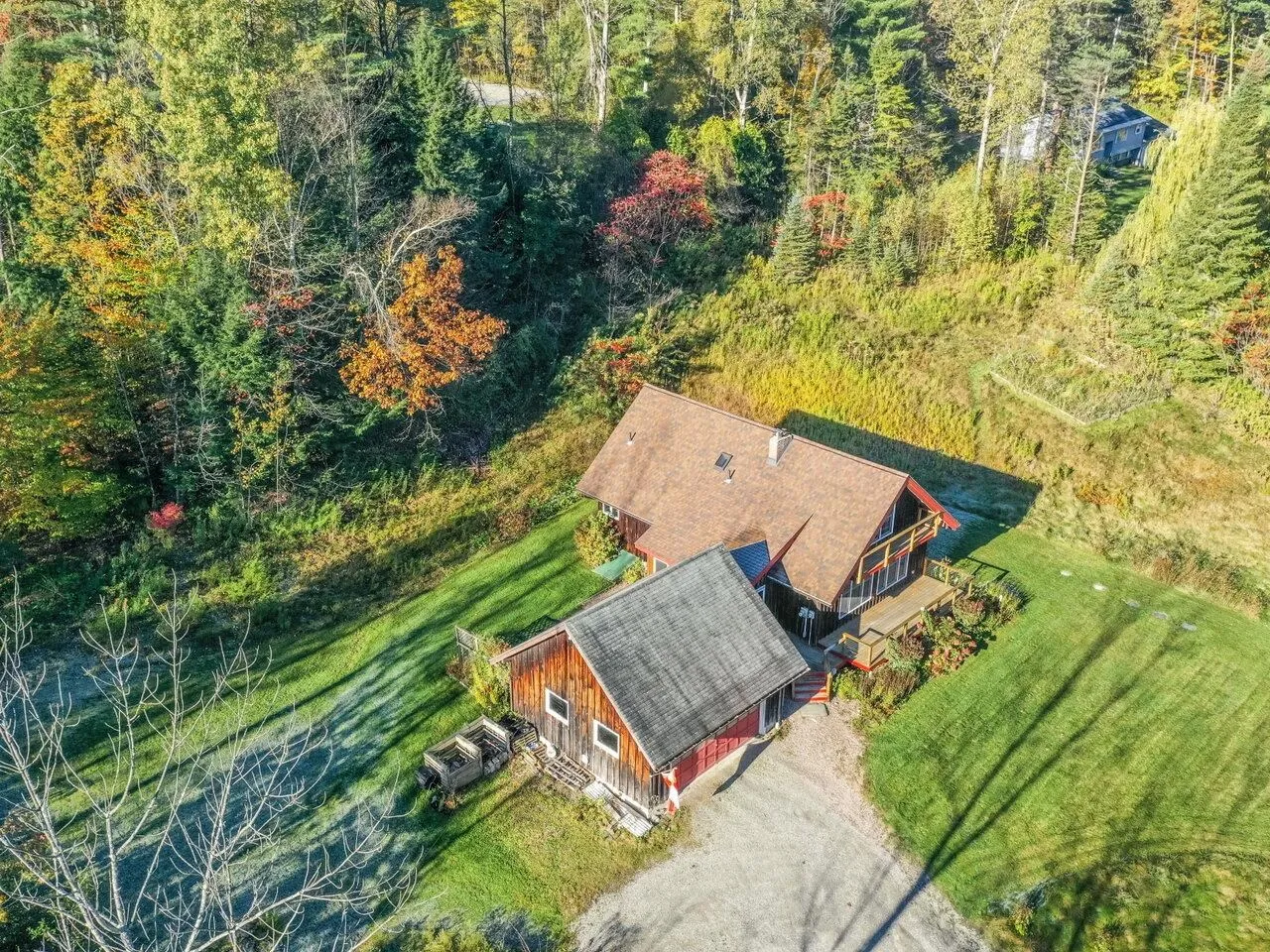 +"PublicRemarks": "Quintessential Vermont chalet-style home nestled on a picturesque 1.96-acre lot in Richmond. This home is anything but cookie-cutter! A large mudroom welcomes you into the home and provides the perfect drop zone for all your gear. The first floor has a warm and inviting floor plan centered around a floor-to-ceiling brick fireplace with wood stove insert. Large windows in the living and dining rooms showcase the beautiful outdoor surroundings, and a natural wood ceiling and hardwood floors add to the warmth and charm of the space. The huge kitchen features abundant cabinet and counter space with a center island for casual gatherings. A first-floor bedroom and half bath complete the main floor. 2 additional bedrooms are located on the second floor with extra closet storage in the shared hallway. The tastefully renovated full bath has shiplap walls, a subway tile bath surround, and updated vanity and fixtures. The home features electric radiant heat and owned solar panels for increased energy efficiency. Outdoor enthusiasts and gardeners will enjoy the lot with numerous perennials, a chicken coop, garden beds, stone patio, a stream, and spacious front deck! There's plenty of storage in the detached 2-car garage and additional shed. Conveniently located just 1.5 miles from Richmond village and close to skiing, mountain biking, and hiking!"