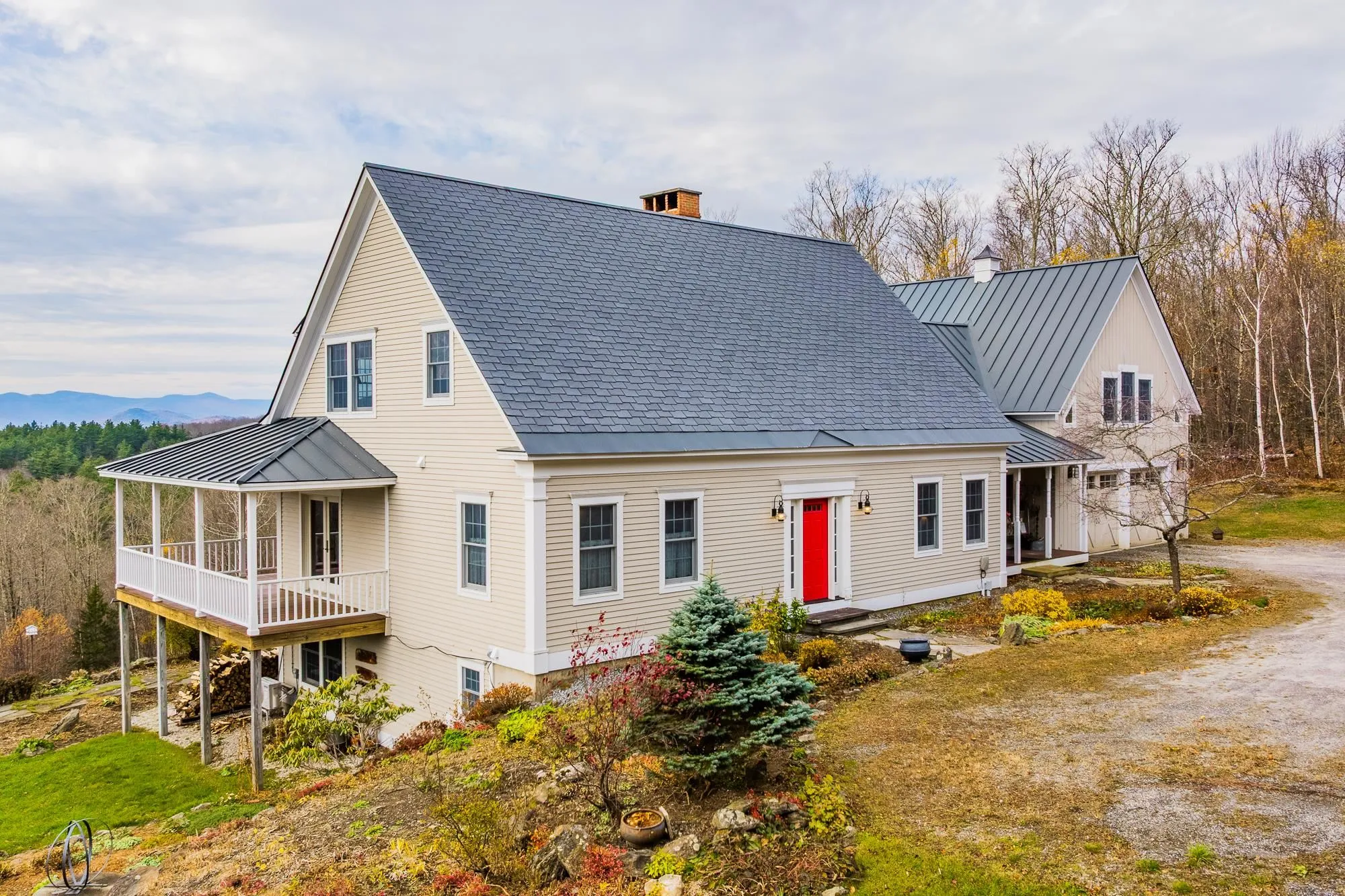 +"PublicRemarks": "Set high on a quiet hillside overlooking the Green Mountains, this exceptional Vermont home blends rustic charm with modern warmth and efficiency. Every space, indoors and out, celebrates its connection to the surrounding landscape. Inviting living areas feature wide-plank floors, exposed beams, and large windows that frame mountain views. The kitchen combines timeless materials with contemporary comfort, offering soapstone counters, custom cabinetry, and a central island. From here, the space flows naturally through the dining room and into the fireside living area, creating a harmonious setting for gatherings and everyday living. The main-level primary suite provides convenience and privacy, complete with a spa-like bath and serene woodland views. Upstairs, additional bedrooms and a light-filled reading nook offer cozy retreats, while a second stairway leads to a flexible suite above the garage, ideal for guests, an office, or creative space. The lower level adds even more versatility, featuring a spacious family or game room with a wood stove and expansive mountain views. Outside, terraced stone gardens, meandering paths, and an expansive wraparound porch create a seamless connection to nature. An extensive network of private trails winds through the property, leading to “The Point,” a tranquil woodland overlook that captures the magic of Vermont’s changing seasons."