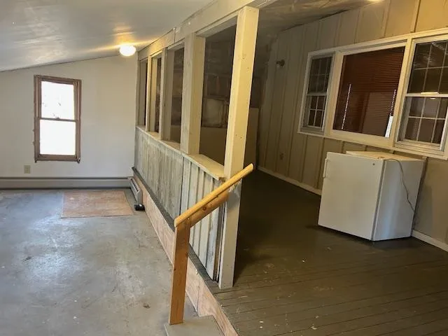 +"PublicRemarks": "Country Charmer on North Road | Royalton, VT Simple living at its finest! This easy-to-maintain home is nestled on the Royalton-Barnard town line and offers a peaceful setting with views of Cleveland Brook flowing gently along the back of the property. Step inside through a heated entry/mudroom, and you’re welcomed into a spacious open concept living area with cathedral ceilings, an abundance of natural light, and serene views of the babbling brook. A full bath with washer and dryer sits just off the main space, along with stairs leading to a generous loft — perfect for a guest area, office, or studio, complete with storage. The main level also features a cozy eat-in kitchen and a comfortable primary bedroom. A side door opens to a heated, semi-finished bonus space, ready for your creative touch---workshop? Additional highlights include a standing seam metal roof, fiber-optic internet, and 1.5 acres of tranquility, just minutes from Barnard village and the natural beauty of Silver Lake State Park. Showings begin Friday, April 25th at 3 PM due to ongoing nearby road construction."