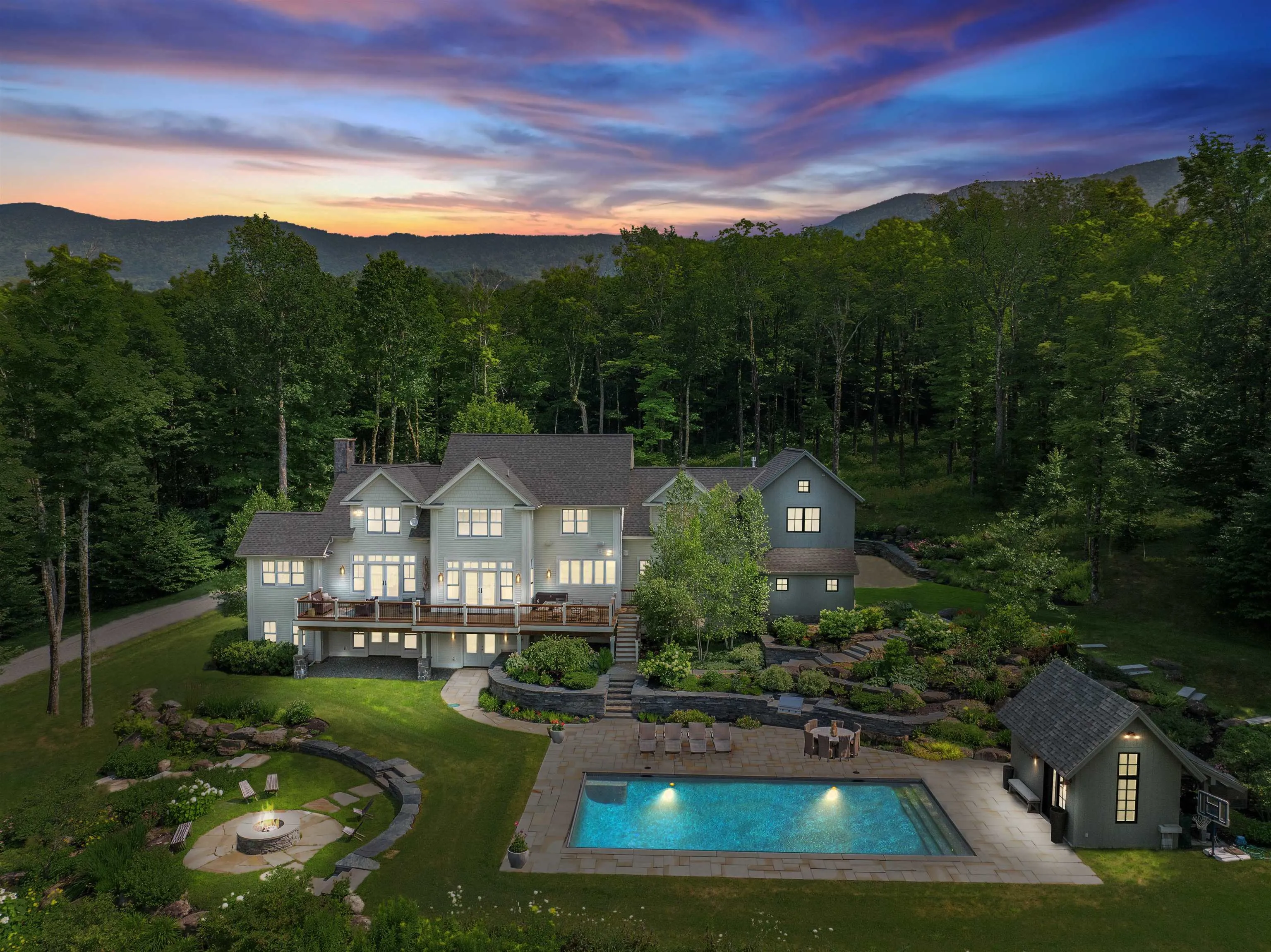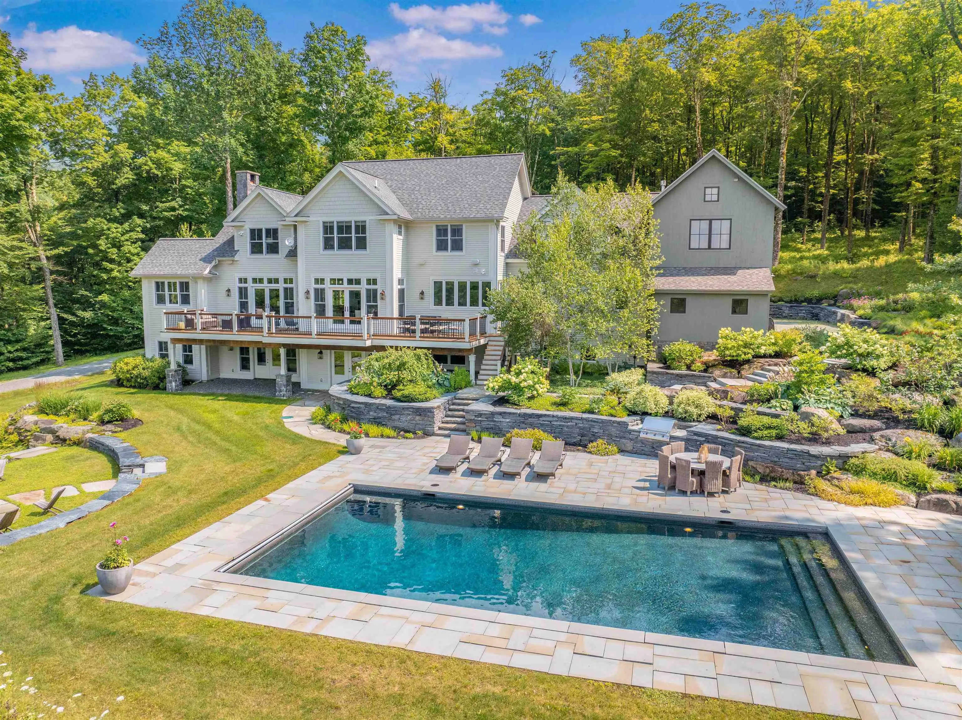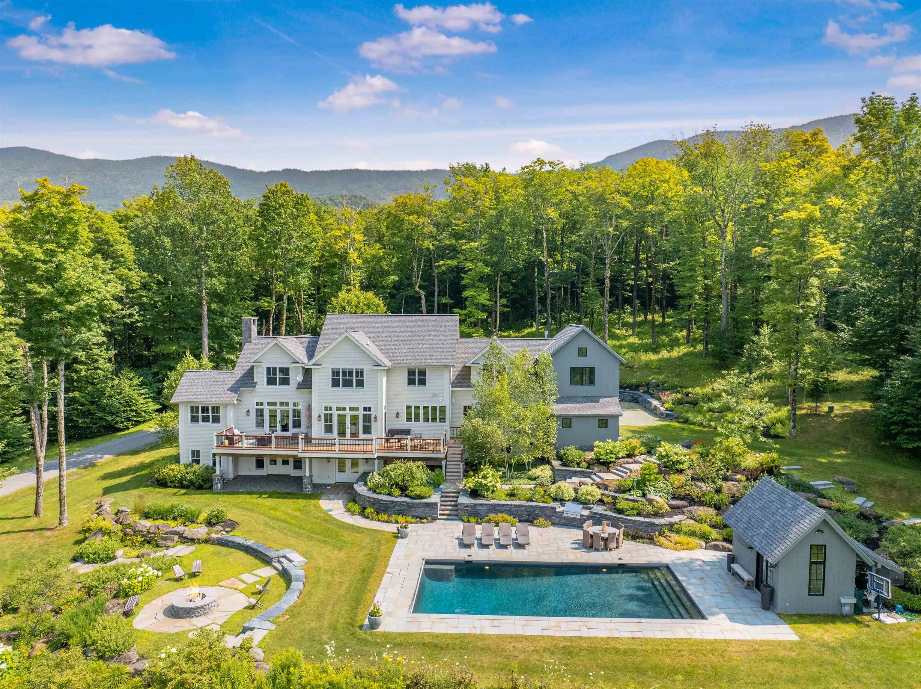 +"Remarks - Public": "Experience the pinnacle of luxury living in this breathtaking home, perfectly situated in the serene and picturesque mountains of Stowe. Nestled on a manicured 8 acre parcel bordering 150 acres of Putnam State Forest, and boasting spectacular views with trail access, this property combines an extensively renovated home with the natural beauty of its surroundings. The gourmet kitchen features high end appliances and custom cabinetry. The kitchen opens up to the expansive first floor that includes vast living and dining areas, a wood burning fireplace, as well a mud room, office and a large deck to take in the views. The upper floor features 4 bedrooms, each including ensuite bathrooms. The lower level includes a guest room with a bathroom, sports room, additional family living space as well as a separate gym or additional office space. This level opens out onto an expansive stone patio that includes a pool and pool house with kitchenette, half bath and outdoor shower. At day's end, gather around the fire pit and utilize the built-in gas grille. Below the patio is a large, illuminated portion of the property perfect for outdoor sports activities. The professionally designed and meticulously maintained landscaping creates a serene outdoor environment. The attached oversized 2 bay garage was enhanced to not only house a large SUV but all of the gear needed for the outdoor adventures Vermont offers. Don’t miss the opportunity to own this magnificent mountain estate."