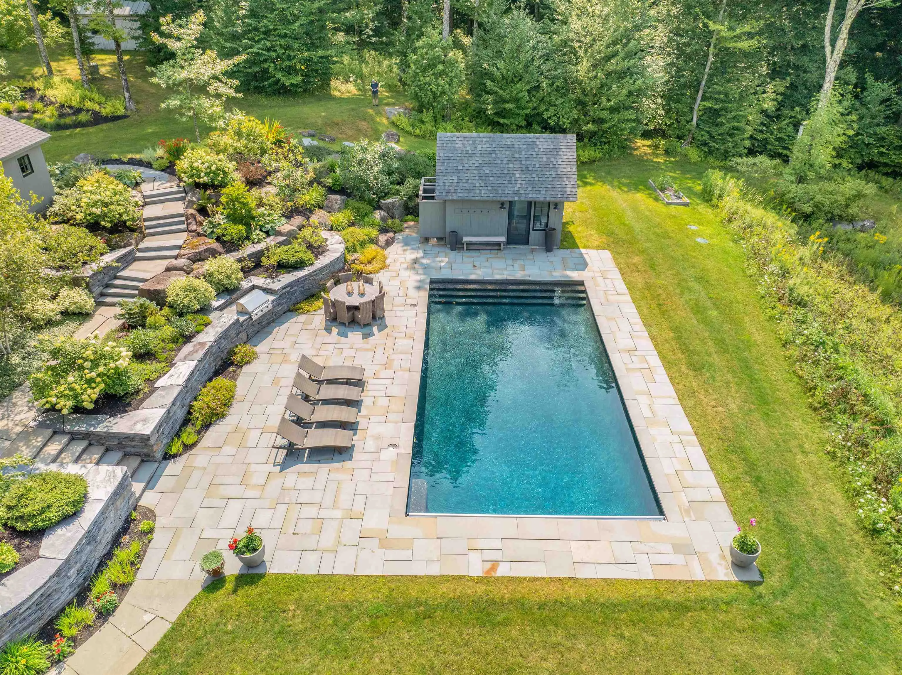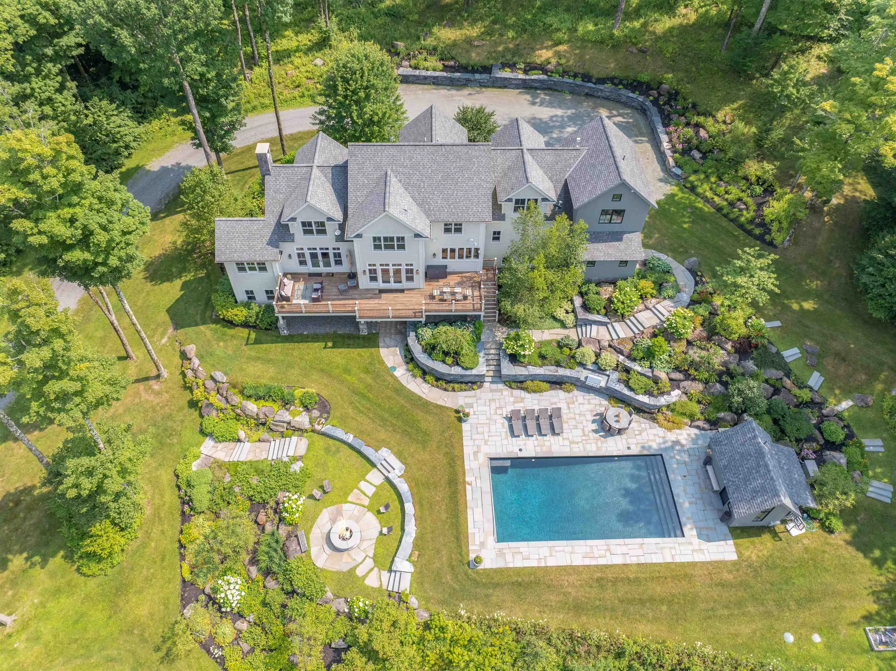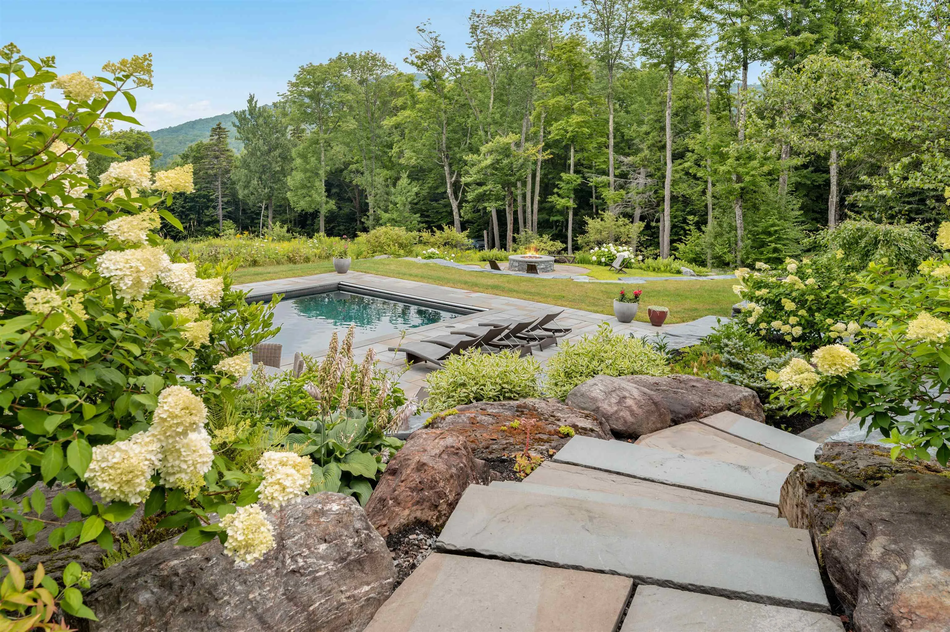 +"Remarks - Public": "Experience the pinnacle of luxury living in this breathtaking home, perfectly situated in the serene and picturesque mountains of Stowe. Nestled on a manicured 8 acre parcel bordering 150 acres of Putnam State Forest, and boasting spectacular views with trail access, this property combines an extensively renovated home with the natural beauty of its surroundings. The gourmet kitchen features high end appliances and custom cabinetry. The kitchen opens up to the expansive first floor that includes vast living and dining areas, a wood burning fireplace, as well a mud room, office and a large deck to take in the views. The upper floor features 4 bedrooms, each including ensuite bathrooms. The lower level includes a guest room with a bathroom, sports room, additional family living space as well as a separate gym or additional office space. This level opens out onto an expansive stone patio that includes a pool and pool house with kitchenette, half bath and outdoor shower. At day's end, gather around the fire pit and utilize the built-in gas grille. Below the patio is a large, illuminated portion of the property perfect for outdoor sports activities. The professionally designed and meticulously maintained landscaping creates a serene outdoor environment. The attached oversized 2 bay garage was enhanced to not only house a large SUV but all of the gear needed for the outdoor adventures Vermont offers. Don’t miss the opportunity to own this magnificent mountain estate."