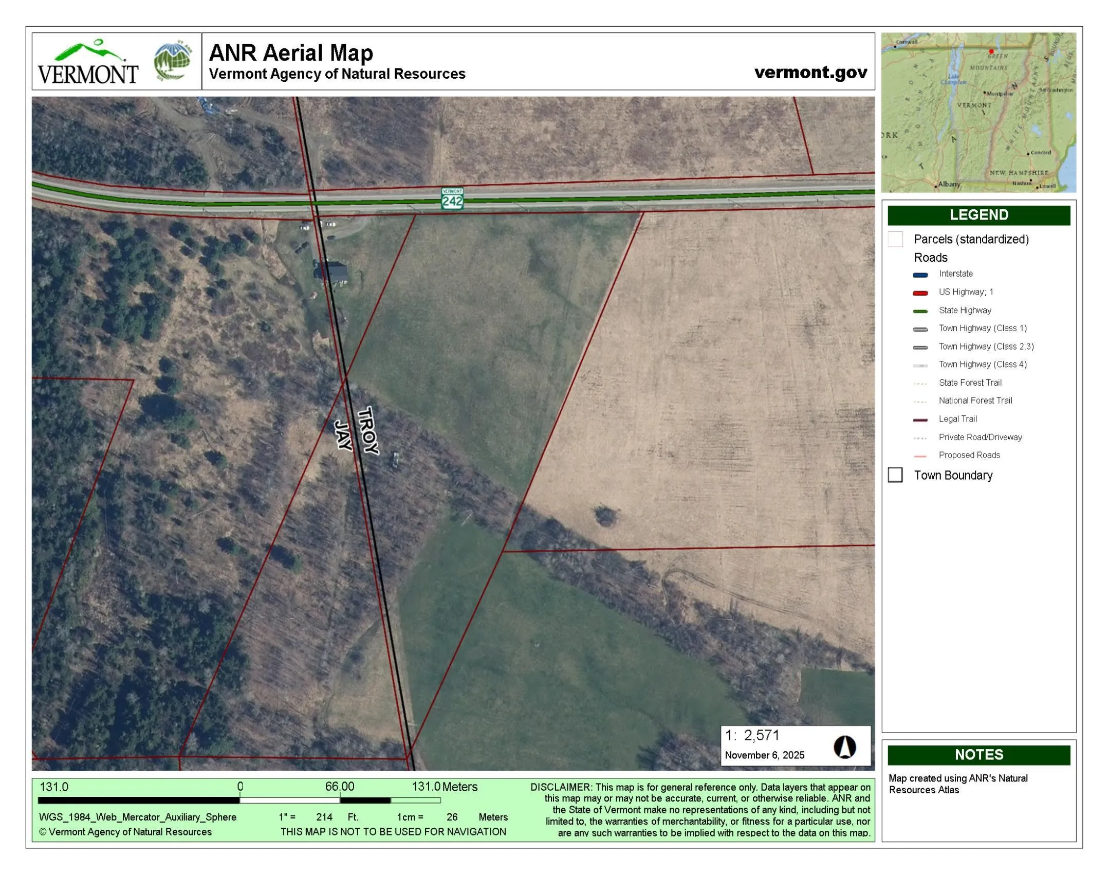 +"Directions": "At intersection of VT-101 and VT-242 proceed West on VT-242 towards Jay Peak approximately 1/4 mile parcel is on Left. See sign"