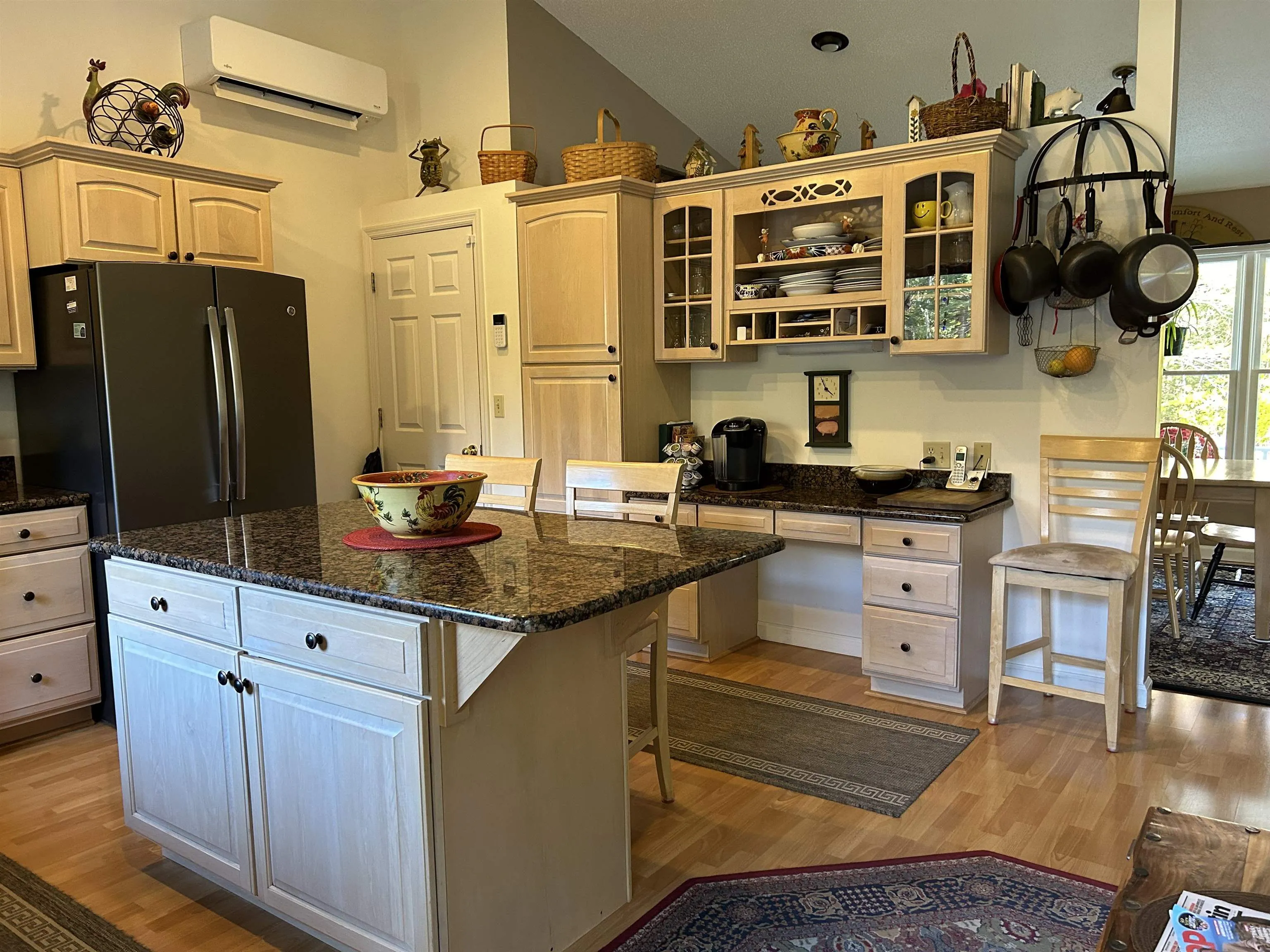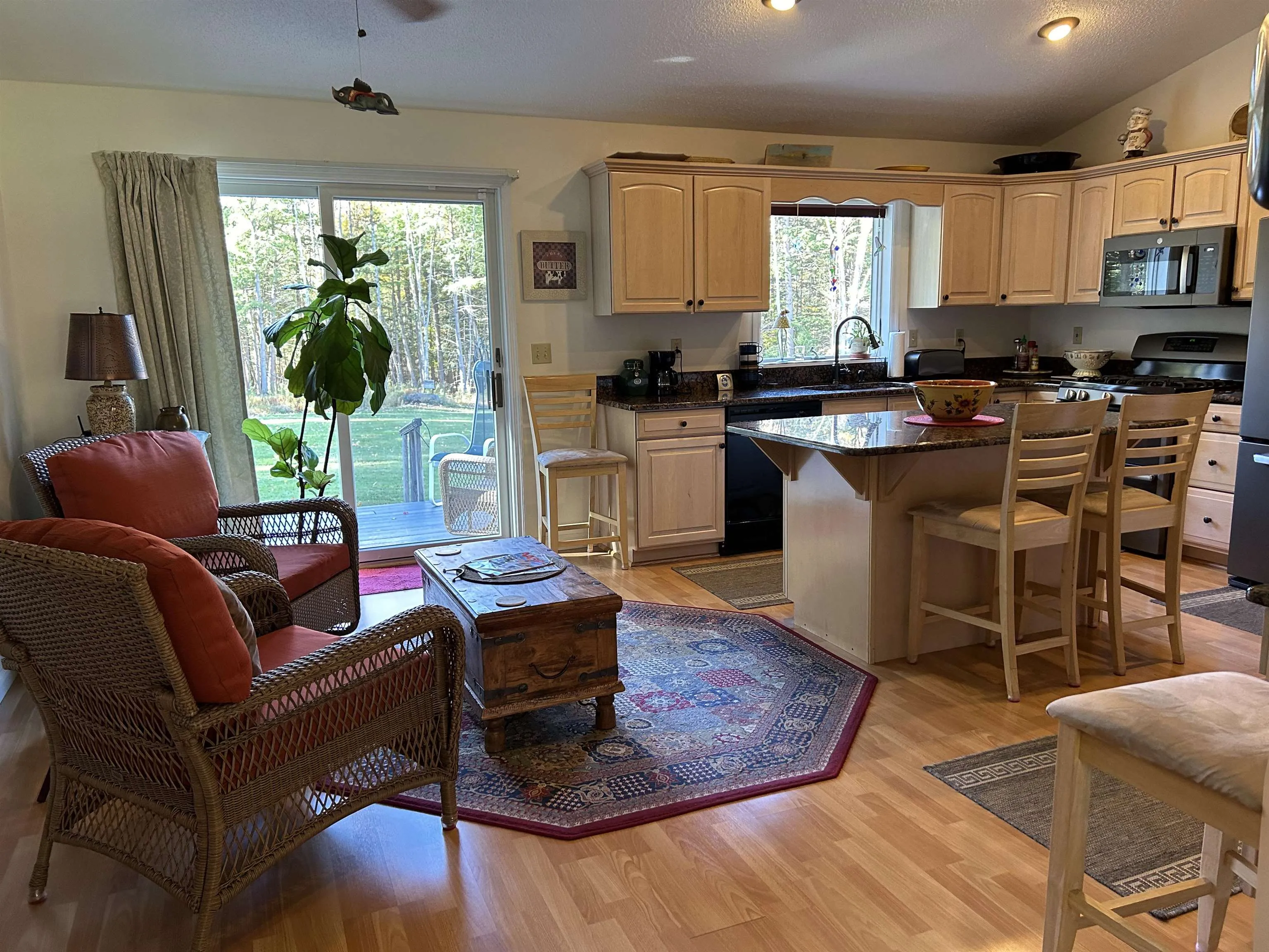 +"PublicRemarks": "What a lovely, private setting for this sweet Energy Efficient Rated Ranch. This 3 bedroom, 2 bath home with attached 2 car garage, has had numerous updates and improvements and is truly a move-in ready home. As you enter into the Foyer, enjoy the open concept to the spacious Living room with sliders to the deck. The kitchen features beautiful maple cabinets with granite countertops. The center island, provides not only workspace, but casual dining or that morning coffee. A lovely seating area looks out over the deck to watch the wildlife or open the sliders for outdoor eating on the deck. The generous Dining Room is ready to host family celebrations and gatherings. The Primary Bedroom Suite has a private bath w/whirlpool tub and tile shower. Plenty of Closet space including a walk-in closet. The full basement has plenty of space, for storage or perhaps a work-out room or crafts and hobbies. There is a 4 bay garage/barn with tons of storage space for cars, garden tools or whatever you collect. Even a 220EV charger plug for your electric car. The upper level could host woodworking or perhaps a home business. There is an owned Solaflect Solar Array on the property providing savings on electric costs, along with heat pumps and more to enjoy carefree living. The property is close to walking trails, ski and recreation areas and much more. One can enjoy small village living at it's best."